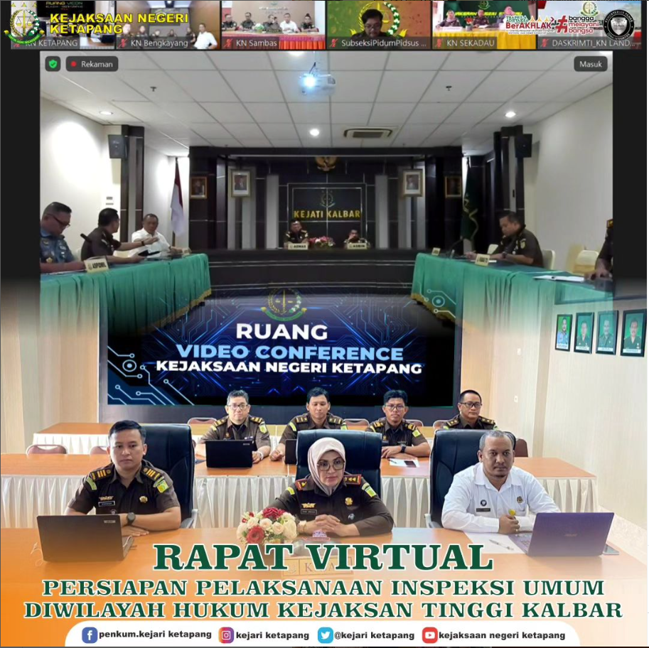 Bertempat di Aula Kejaksaan Negeri Ketapang, Kepala Kejaksaan Negeri Ketapang, Ibu RA Dhini Ardhany, S.H., M.H, Para Kepala Seksi, Kasubbagbin, Jaksa Fungsional beserta Pegawai Kejaksaan Negeri Ketapang mengikuti Rapat Virtual Persiapan Pelaksanaan Inspeksi Umum di Wilayah Hukum Kejaksaan Tinggi Kalimantan Barat.