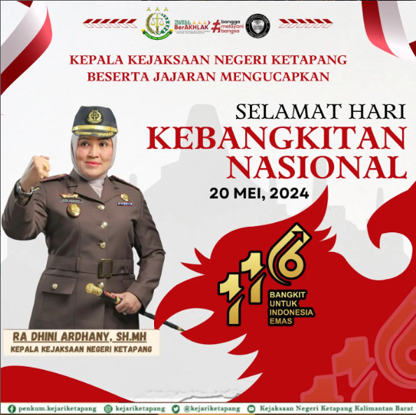 Kepala Kejaksaan Negeri Ketapang RA Dhini Ardhany, S.H., M.H beserta jajaran mengucapkan Selamat Hari Kebangkitan Nasional.