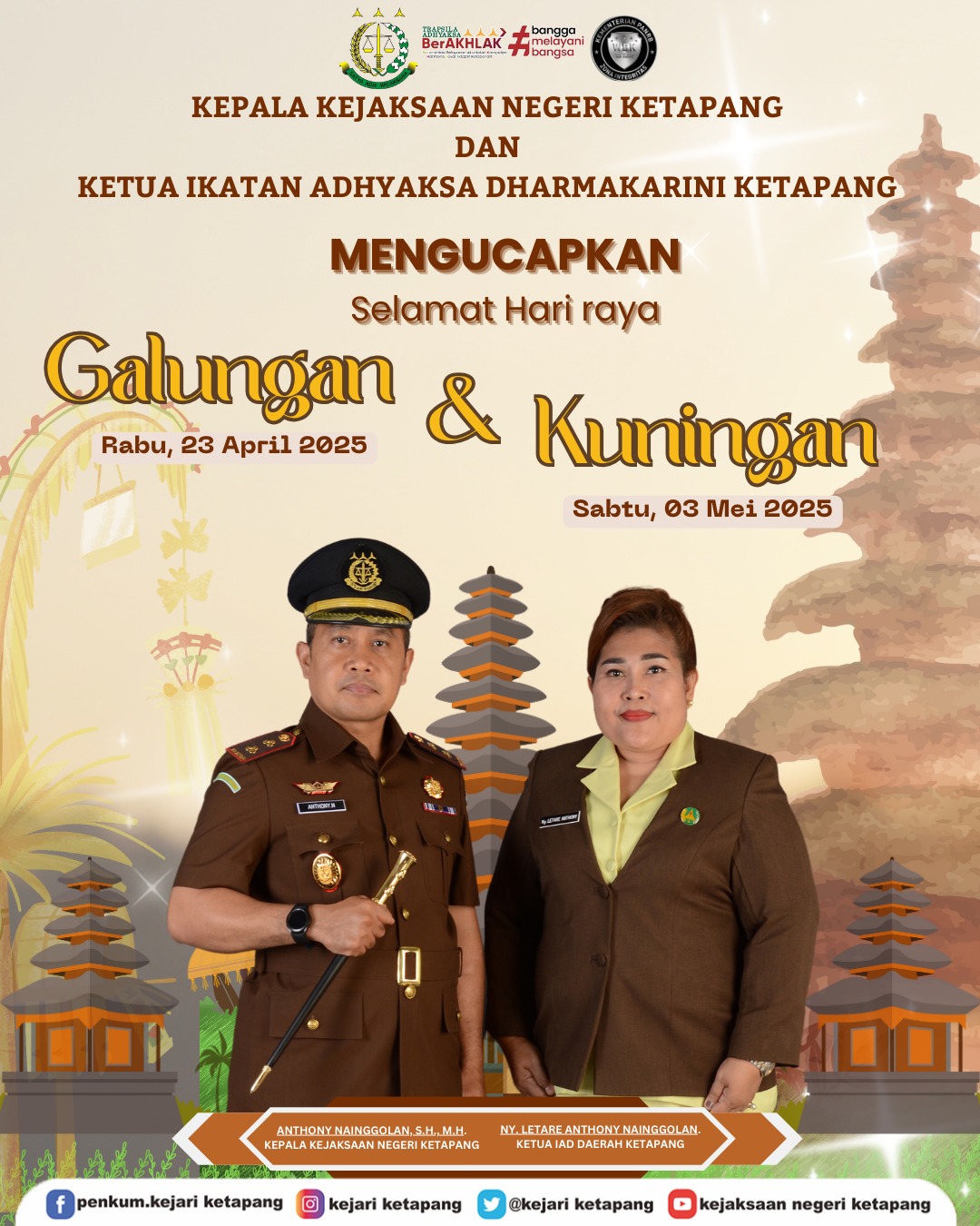 Kepala Kejaksaan Negeri Ketapang Bapak Anthony Nainggolan, S.H., M.H. dan Ketua IAD Daerah Ketapang Ny. Letare Nainggolan beserta seluruh Jajaran mengucapkan Selamat hari Raya Galungan dan Kuningan.