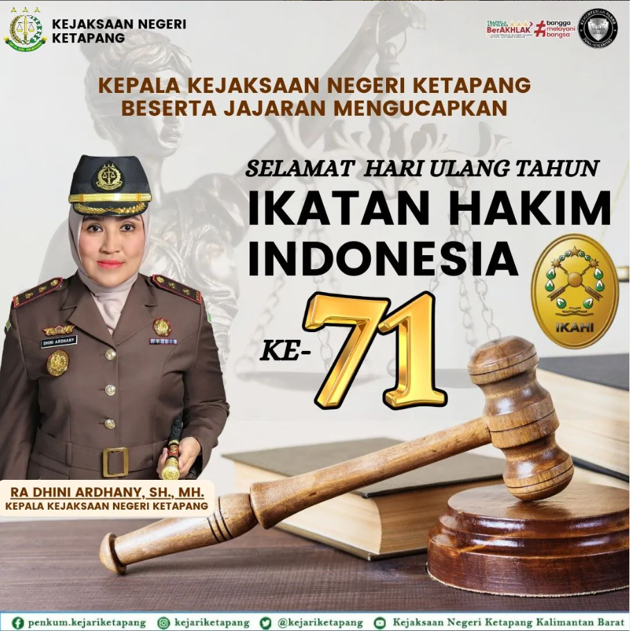 Kepala Kejaksaan Negeri Ketapang RA Dhini Ardhany, S.H., M.H beserta jajaran mengucapkan Selamat Hari Ulang Tahun IKATAN HAKIM INDONESIA ke – 71.