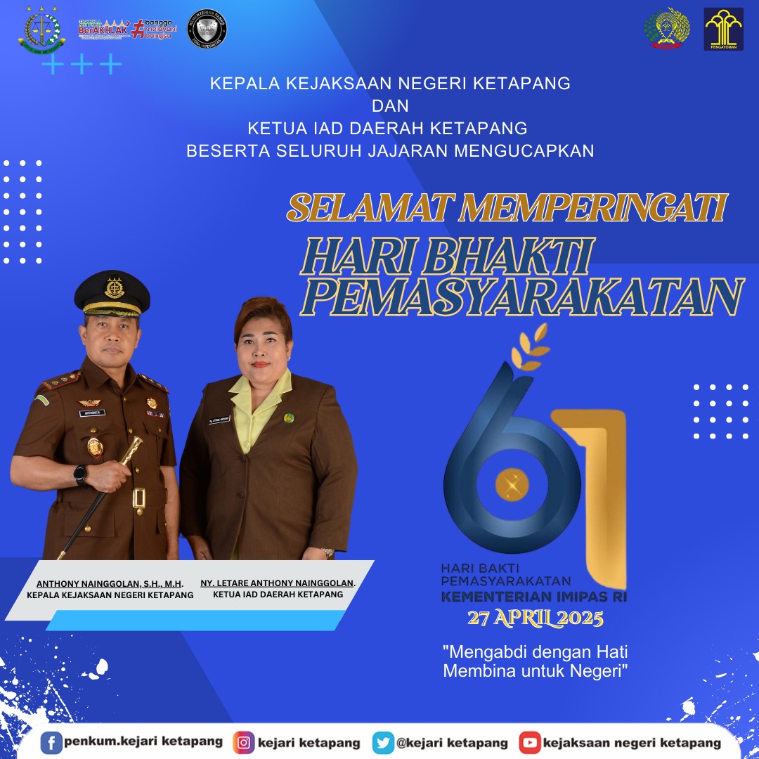 Kepala Kejaksaan Negeri Ketapang Bapak Anthony Nainggolan, S.H., M.H. dan Ketua IAD Daerah Ketapang Ny. Letare Nainggolan beserta seluruh Jajaran mengucapkan Selamat memperingati Hari Bhakti Pemasyarakatan ke – 61.