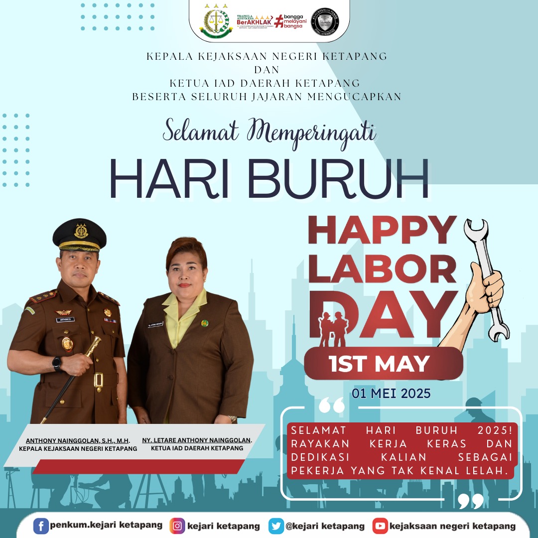 Kepala Kejaksaan Negeri Ketapang Bapak Anthony Nainggolan, S.H., M.H. dan Ketua IAD Daerah Ketapang Ny. Letare Nainggolan beserta seluruh Jajaran mengucapkan Selamat memperingati Hari Buruh Happy Labor Day.