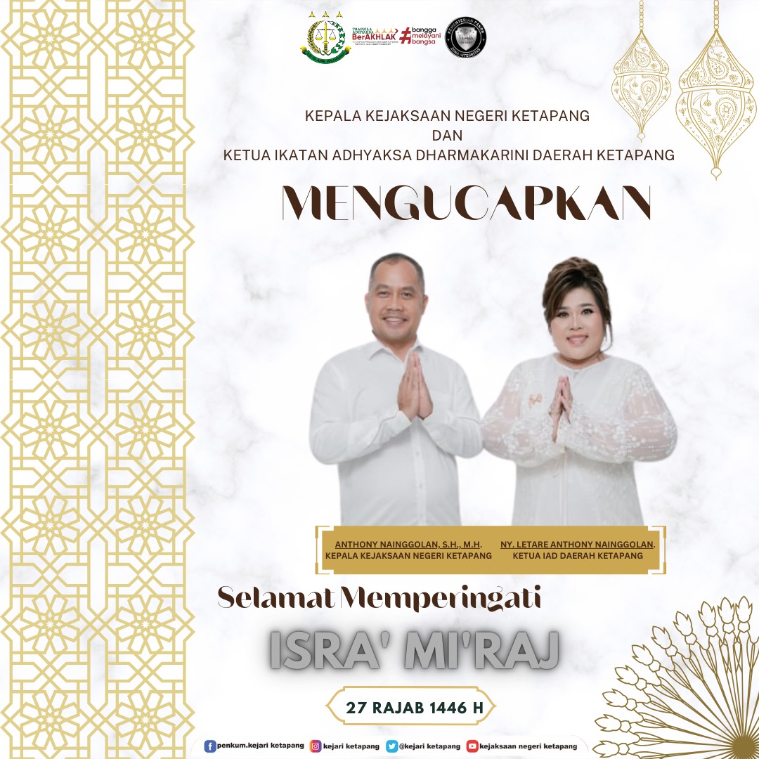 Kepala Kejaksaan Negeri Ketapang Bapak Anthony Nainggolan, S.H.,M.H., dan Ketua IAD Daerah Ketapang Beserta jajaran mengucapkan selamat memperingati Isra’ Mi’raj.