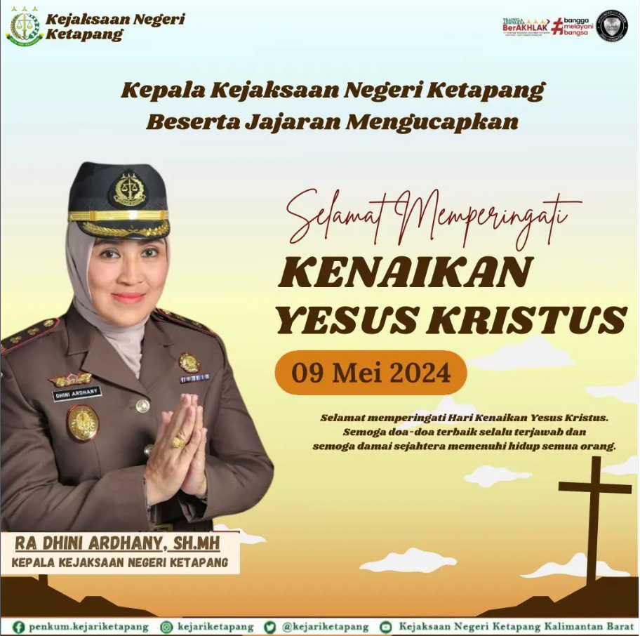 Kepala Kejaksaan Negeri Ketapang RA Dhini Ardhany, S.H., M.H beserta jajaran mengucapkan Selamat memperingati Kenaikan Yesus Kristus.