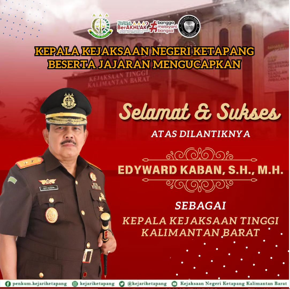 Kepala Kejaksaan Negeri Ketapang Ibu RA Dhini Ardhany, S.H., M.H beserta jajaran mengucapkan Selamat & Sukses atas dilantiknya Bapak EDYWARD KABAN, S.H., M.H. Sebagai Kepala Kejaksaan Tinggi Kalimantan Barat.