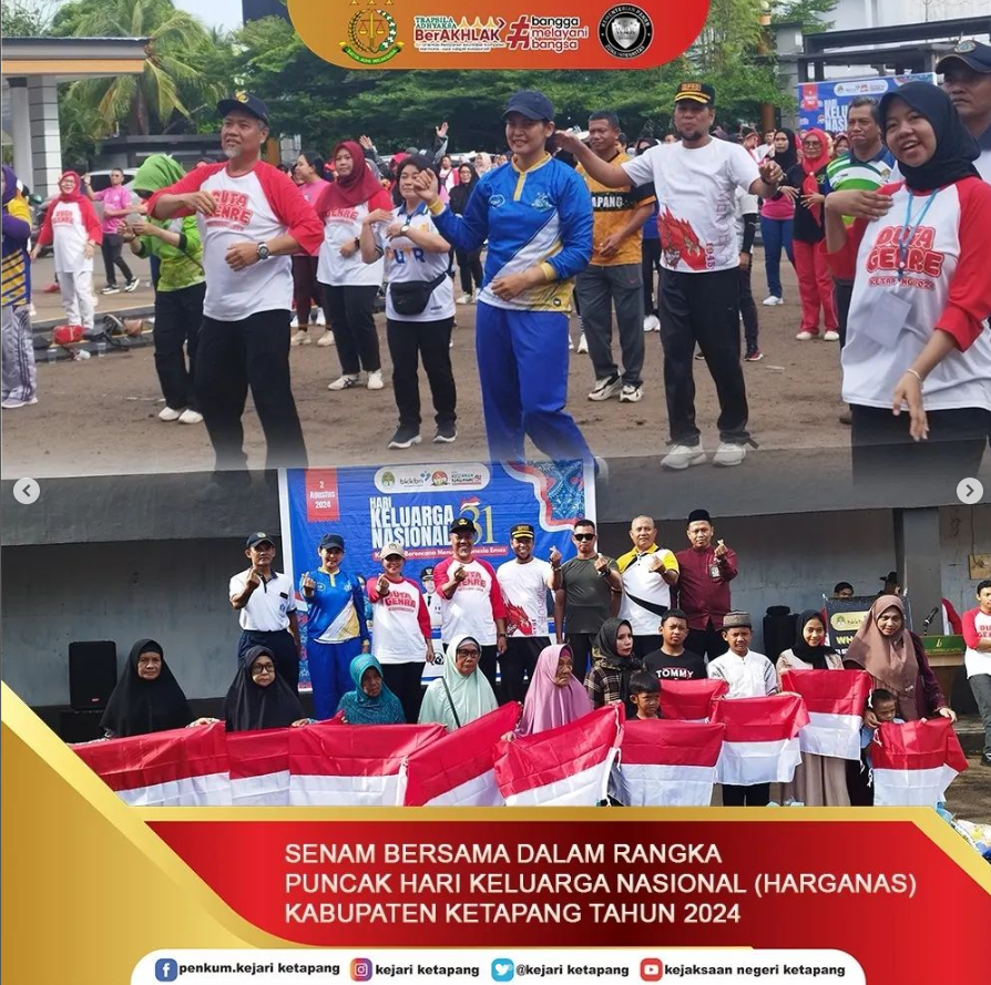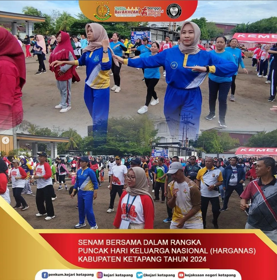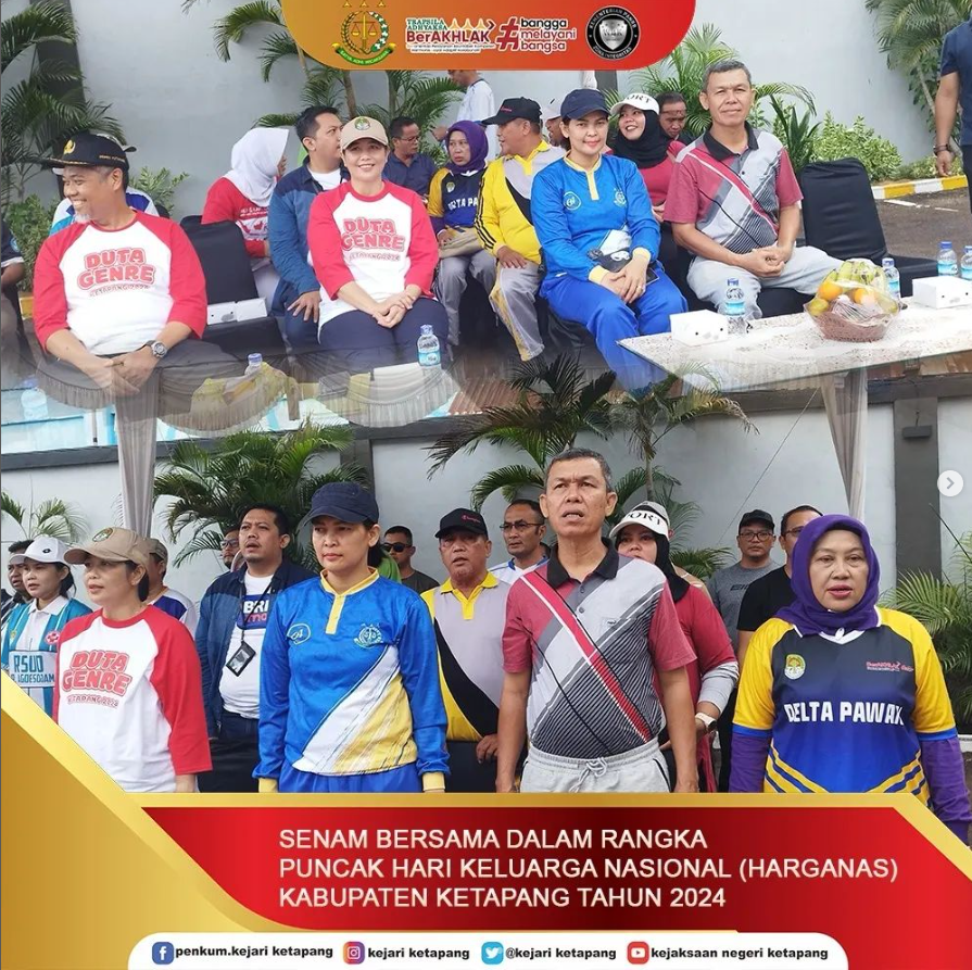 Bertempat di Halaman Borneo Emerald Hotel Ketapang, Kepala Kejaksaan Negeri Ketapang diwakili oleh Kasi Pengelolaan Barang Bukti dan Barang Rampasan, Wara Endrini, S.T., S.H., M.H, menghadiri Senam Bersama dalam Rangka Puncak Hari Keluarga Nasional (HARGANAS) Kabupaten Ketapang Tahun 2024.