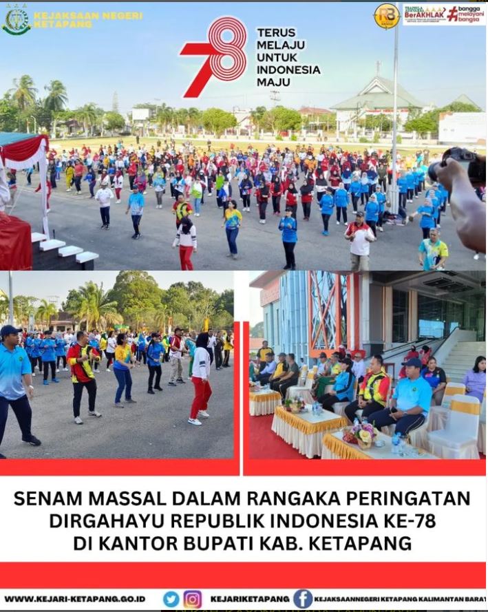 Bertempat di Halaman Kantor Bupati Ketapang, Jalan Jend.Sudirman, Kelurahan Sampit, Kecamatan Delta Pawan, Kabupaten Ketapang. Kepala Sub Bagian Pembinaan, Doni Marianto, S.H., beserta Pegawai Kejaksaan Negeri Ketapang. Menghadiri Senam Massal Dalam Rangka Peringatan Dirgahayu Republik Indonesia Ke-78.