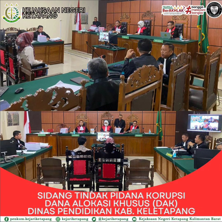 Bertempat di Ruang Sidang Pengadilan Tindak Pidana Korupsi Pontianak, Jaksa Penuntut Umum pada Kejaksaan Negeri Ketapang melaksanakan sidang lanjutan dalam Perkara Dugaan Tindak Pidana Korupsi Dana Alokasi Khusus (DAK) 2023 Dinas Pendidikan Kabupaten Ketapang yang di lakukan oleh Penyelenggara Negara pada Dinas Pendidikan Kabupaten Ketapang, dengan Agenda Persidangan pemeriksaan terhadap 3 orang saksi berinisial K, H dan L, serta dilakukan pemeriksaan terhadap Ahli.