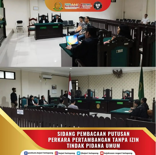 Bertempat di Ruang Sidang Pengadilan Negeri Ketapang, Jaksa Penuntut Umum pada Kejaksaan Negeri Ketapang Melaksanakan sidang Tindak Pidana Umum Perkara Penambangan tanpa Izin (Ilegal) di Dusun Pemuatan Bantu, Desa Nanga Kelampai, Kec. Tumbang Titi, Kab. Ketapang, yang dilakukan oleh Terdakwa dengan Inisial YH, Terdakwa merupakan Warga Negara China, Adapun agenda persidangan pada hari ini adalah Agenda Pembacaan Putusan dari Majelis Hakim.