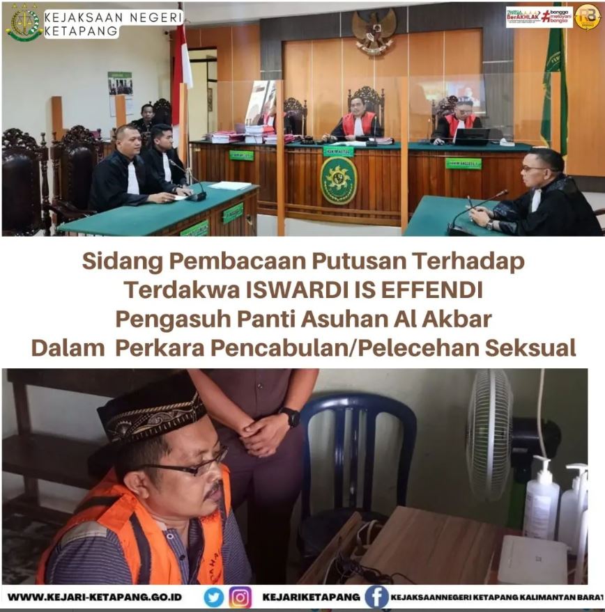 Pada hari Rabu 17 Mei 2023 di Ruang Sidang Pengadilan Negeri Ketapang Jalan Jendral Sudirman, Kecamatan Delta Pawan Kabupaten Ketapang telah berlangsung sidang secara daring (online) terhadap Terdakwa an. ISWARDI IS EFFENDI Als IS Bin (alm) ISMAIL (Ustadz /Pengasuh Panti Asuhan Al-Akbar), dalam Perkara Pencabulan/Pelecehan Seksual, dengan agenda Pembacaan Putusan Hakim, Bahwa korban yang dicabuli oleh terdakwa sebanyak 6 korban yang diketahui.