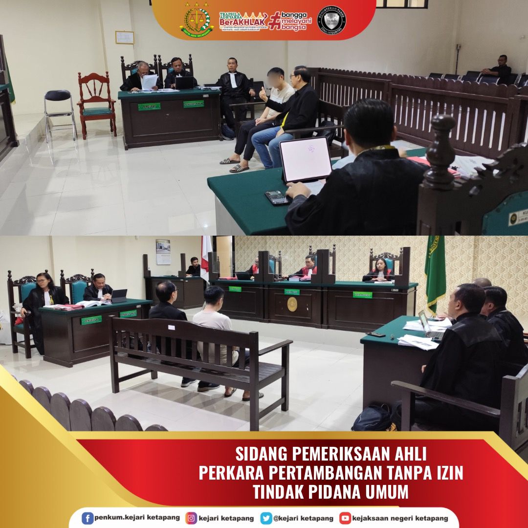 Bertempat di Ruang Sidang Pengadilan Negeri Ketapang, Jaksa Penuntut Umum pada Kejaksaan Negeri Ketapang Melaksanakan sidang Tindak Pidana Umum Perkara Penambangan tanpa Izin (Ilegal) di Dusun Pemuatan Bantu Desa Nanga Kelampai Kec. Tumbang Titi Kab. Ketapang yang dilakukan oleh Terdakwa dengan Inisial YH yang merupakan Warga Negara China, Adapun agenda persidangan pada hari ini adalah Pemeriksaan Saksi Ahli dari Jaksa Penuntut Umum.