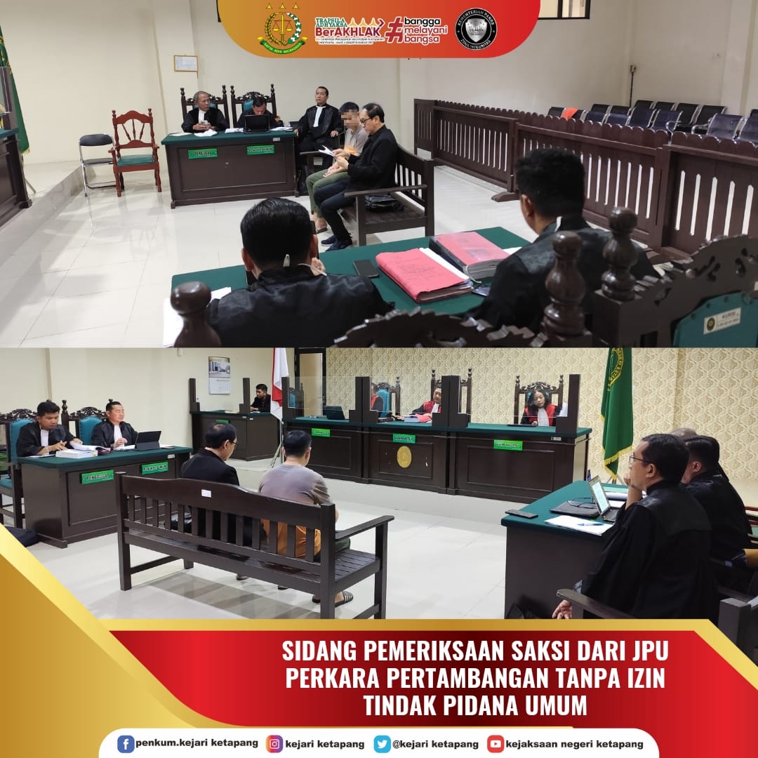 Bertempat di Ruang Sidang Pengadilan Negeri Ketapang, Jaksa Penuntut Umum pada Kejaksaan Negeri Ketapang Melaksanakan sidang Tindak Pidana Umum Perkara Penambangan tanpa Izin (Ilegal) di Dusun Pemuatan Bantu Desa Nanga Kelampai Kec. Tumbang Titi Kab. Ketapang yang dilakukan oleh Terdakwa dengan Inisial YH yang merupakan Warga Negara China, Adapun agenda persidangan pada hari ini adalah Pemeriksaan Saksi dari Jaksa Penuntut Umum.