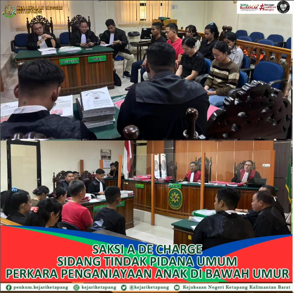 [Rabu, 12 Juni 2024] Bertempat di Ruang Sidang Pengadilan Negeri Ketapang, Jaksa Penuntut Umum pada Kejaksaan Negeri Ketapang Melaksanakan sidang Tindak Pidana Umum Perkara Kekerasan anak dibawah umur yang menyebabkan meninggalnya seorang anak perempuan atas nama Yesa Angelica yang terjadi di Kec. Sandai Kab. Ketapang yang dilakukan oleh SST als AK ( Ibu angkat korban ), YLT als AN ( Ayah Angkat Korban ), beserta MLS, V DS, AMP, DS, dan AA yang merupakan Karyawan di tempat usaha Ayah angkat Korban, dengan agenda persidangan mendengarkan keterangan saksi A De Charge. Bahwa dalam acara pemeriksaan saksi a de charge dihadirkan sebanyak 2 orang Saksi dari Penasehat Hukum Terdakwa.