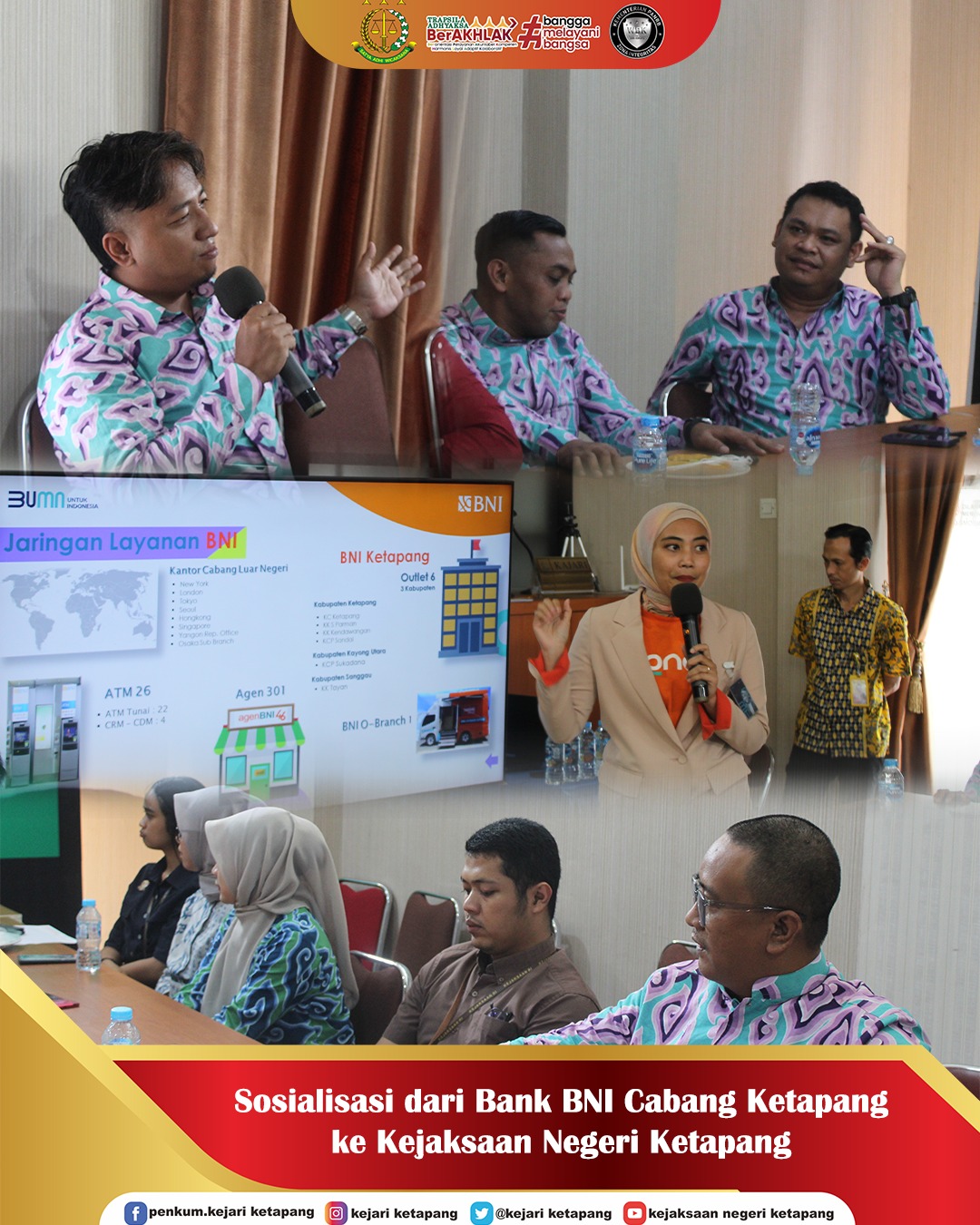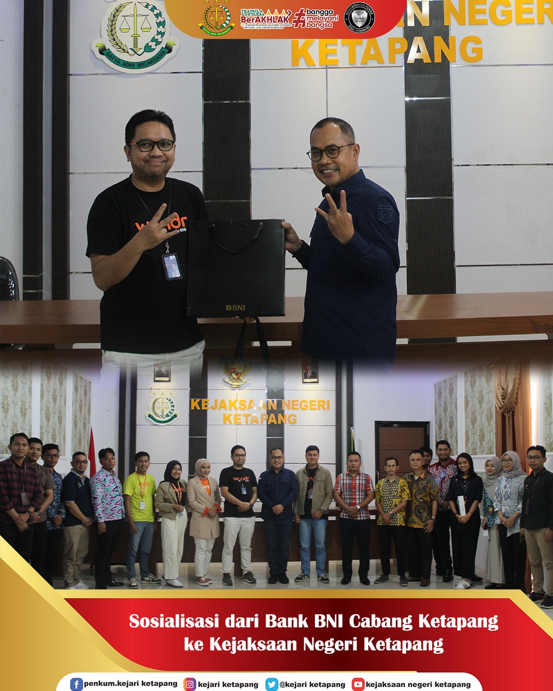 Bertempat di Aula Kantor Kejaksaan Negeri Ketapang. Kepala Kejaksaan Negeri Ketapang Bapak Anthony Nainggolan, S.H., M.H. di dampingi Para Kasi dan Kasubagbin, serta seluruh Pegawai Kejaksaan Negeri Ketapang mengikuti Sosialisasi oleh Bank BNI Cabang Ketapang ke Kejaksaan Negeri Ketapang.