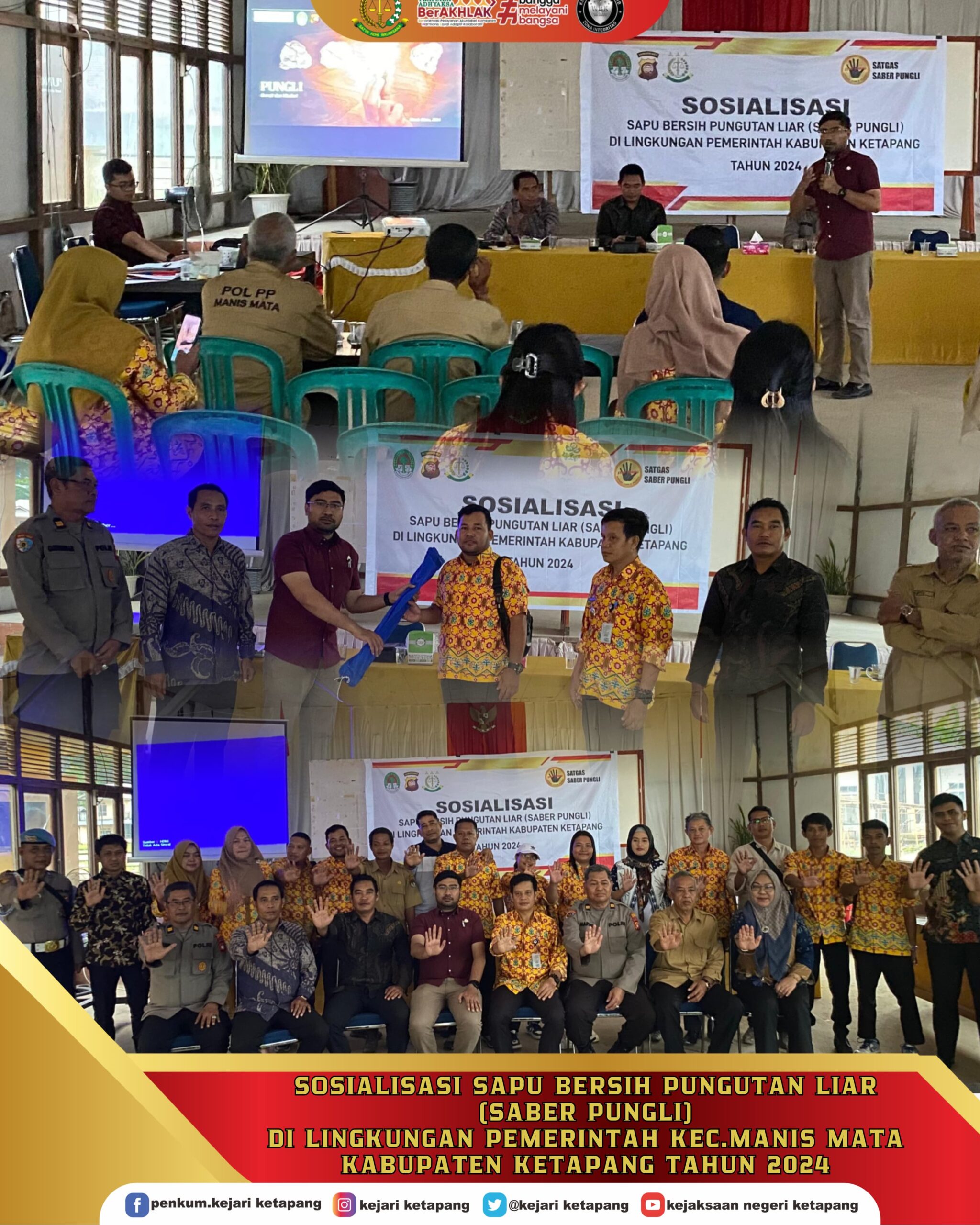 Bertempat di kantor Kecamatan Manis Mata Kab. Ketapang, Kepala Kejaksaan Negeri Ketapang diwakili oleh Jaksa Fungsional pada Seksi Intelijen John Latumeten, S.H mengikuti Sosialisasi Sapu Bersih Pungutan Liar (SABER PUNGLI) di Lingkungan Pemerintah Kecamatan Manis Mata Kabupaten Ketapang Tahun 2024.
