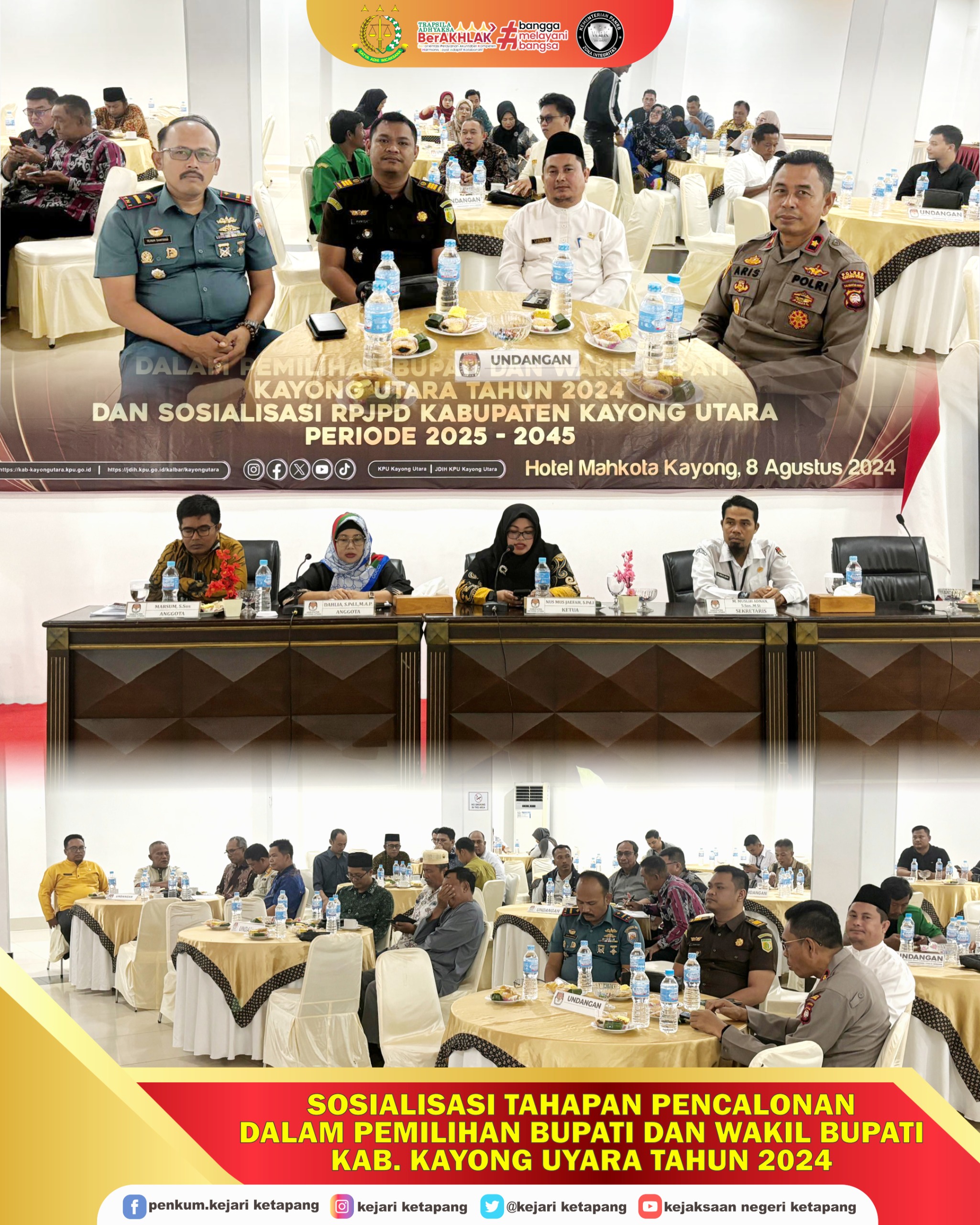 Bertempat di Hotel Mahkota Kabupaten Kayong Utara. Kepala Kejaksaan Negeri Ketapang diwakili oleh Kepala Seksi Intelijen Panter Rivay Sinambela, S.H. menghadiri Acara Sosialisasi Tahapan Pencalonan dalam Pemilihan Bupati dan Wakil Bupati kayong Utara tahun 2024 dan Sosialisasi RPJPD Kabupaten Kayong Utara Periode 2025 – 2045.