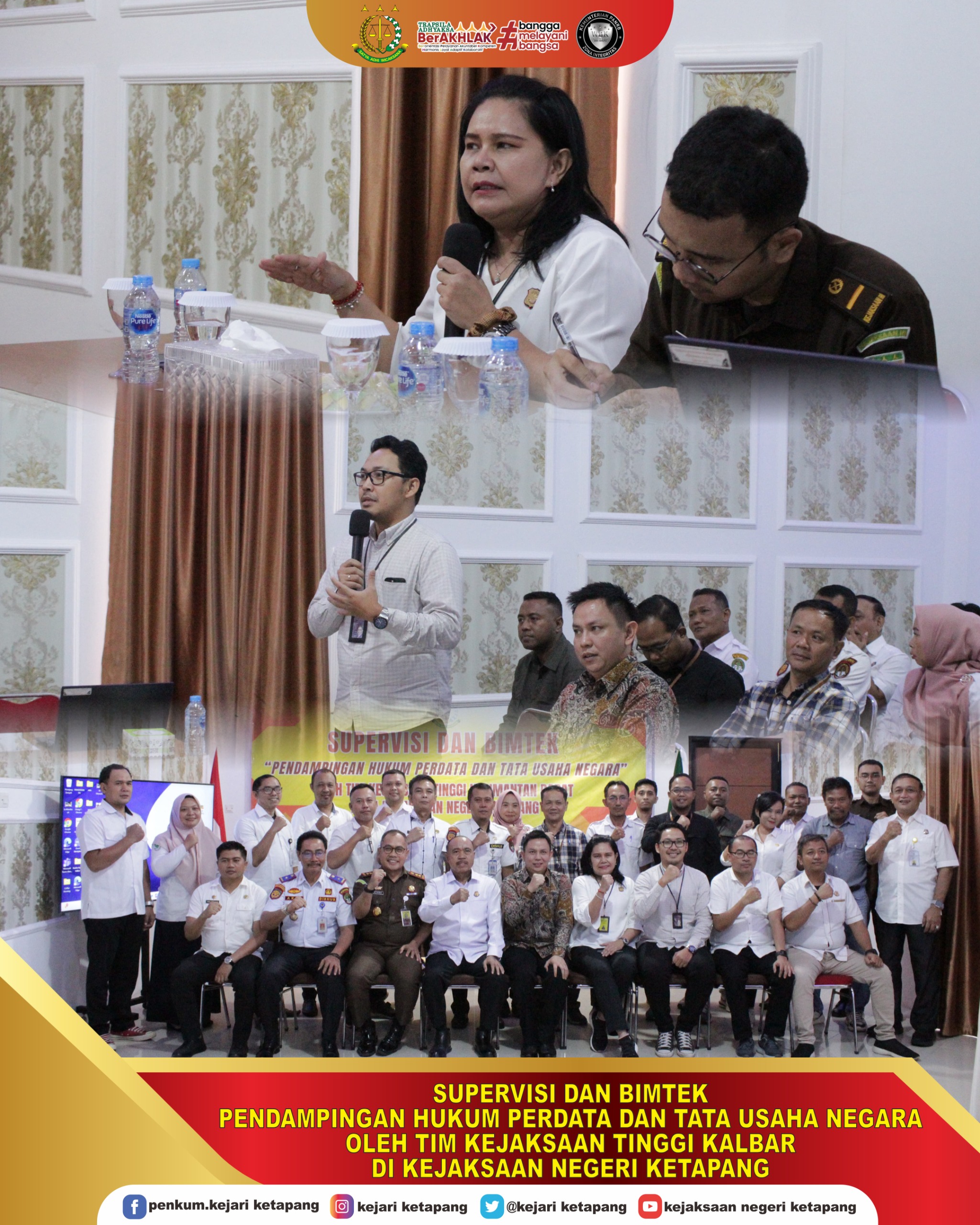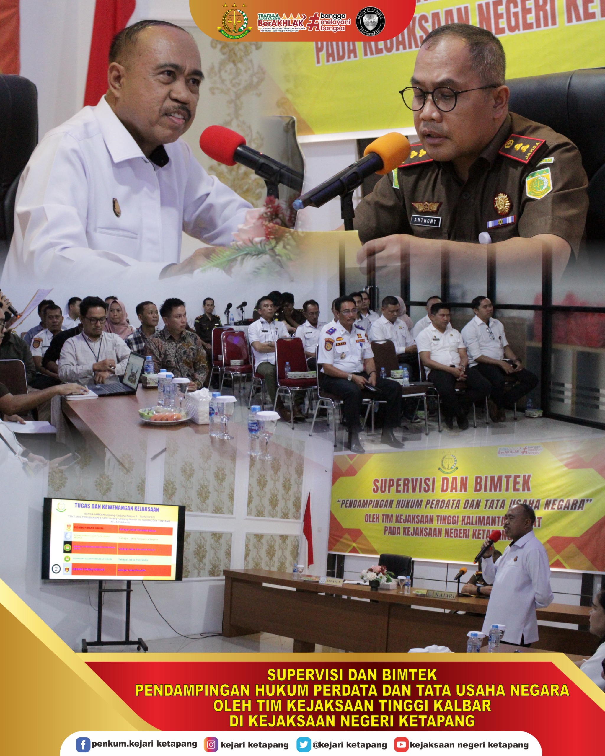 Kepala Kejaksaan Negeri Ketapang Bapak Anthony Nainggolan, S.H., M.H., Kasi Datun Dhimas Mahendra W, S.H., M.H., beserta staf Bidang Datun Kejaksaan Negeri Ketapang menerima Kunjungan Supervisi dan Bimtek Pendampingan Hukum Perdata dan Tata Usaha Negara oleh Tim Kejaksaan Tinggi Kalimantan Barat di Kejaksaan Negeri Ketapang.