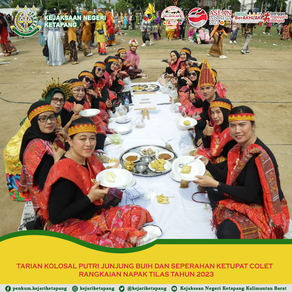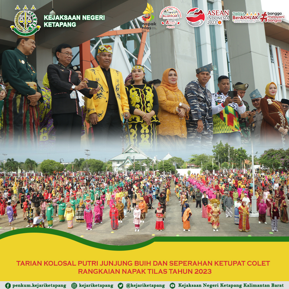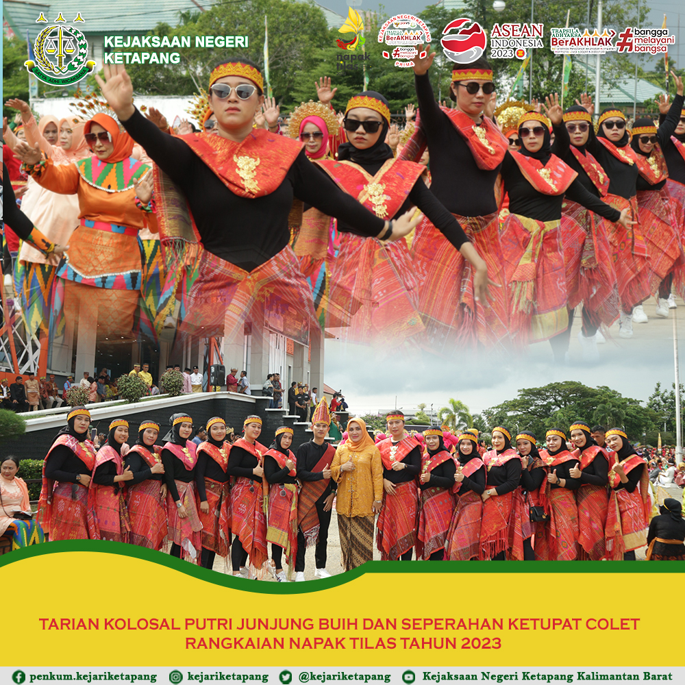Bertempat di Lapangan Bupati Ketapang, Jalan Jend Sudirman, Kecamatan Delta Pawan, Kabupaten Ketapang. Kepala Kejaksaan Negeri Ketapang Ibu RA. Dhini Ardhany, S.H., M.H. Menghadiri Acara Tarian Kolosal Putri Junjung Buih dan Seperahan Ketupat Colet rangkaian Napak Tilas Kabupaten Ketapang Tahun 2023. Bahwa Tim Kejaksaan Negeri Ketapang juga ikut serta dalam Tarian Kolosal Putri Junjung Buih dan Seperahan Ketupat Colet.