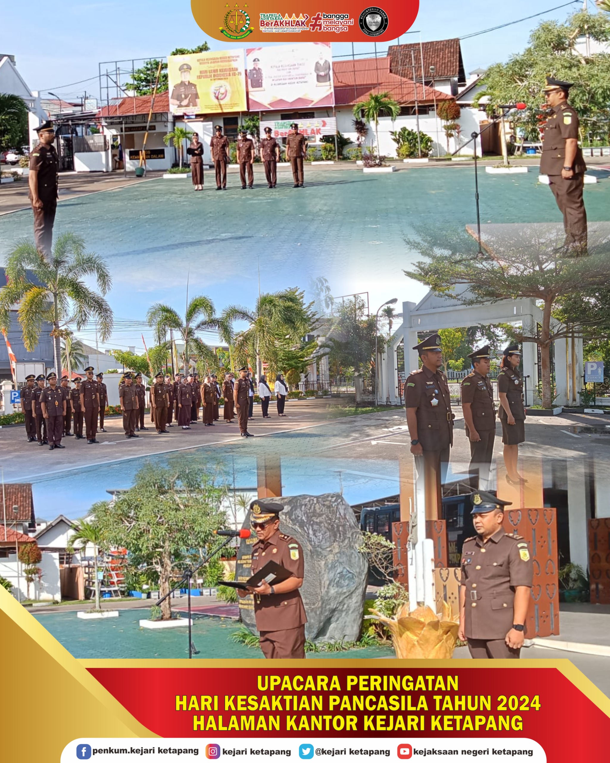 Bertempat di Halaman Kantor Kejaksaan Negeri Ketapang, telah dilaksanakan Upacara Peringatan Hari Kesaktian Pancasila Tahun 2024 dengan tema “Bersama Pancasila Kita Wujudkan Indonesia Emas”, adapun bertindak Sebagai Inspektur Upacara Kasi Tindak Pidana Khusus M. Bayu Segara, S.H. yang diikuti oleh seluruh Pegawai dan PPNPN Kejaksaan Negeri Ketapang.