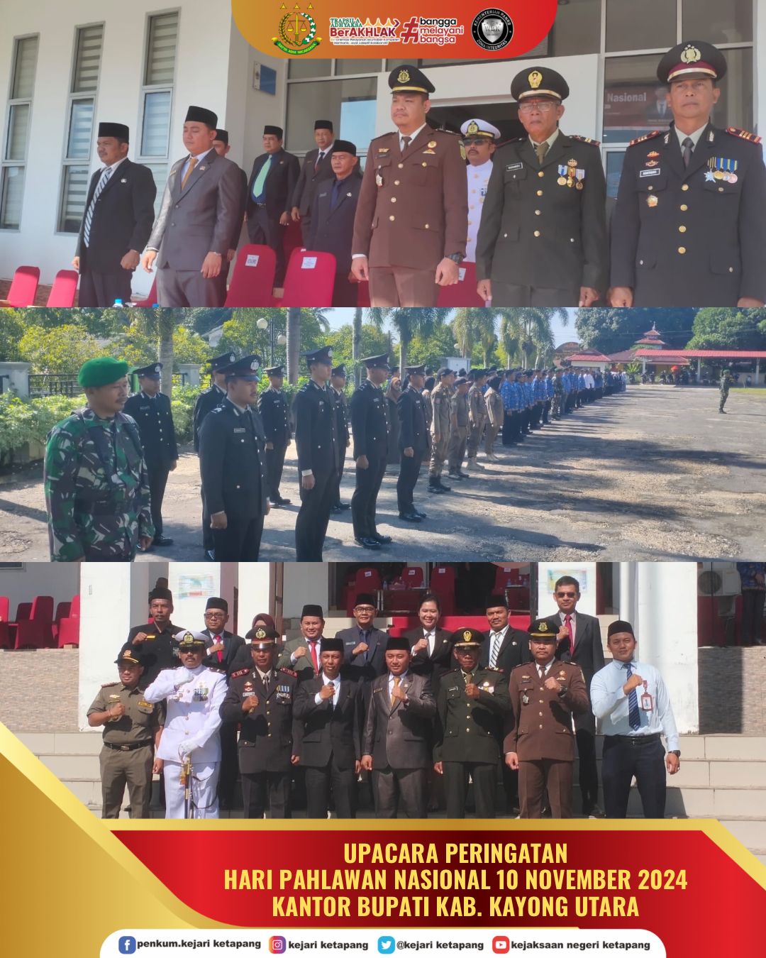 Bertempat di Kantor Bupati Kabupaten Kayong Utara, Kepala Kejaksaan Negeri Ketapang diwakili oleh Kepala Seksi Intelijen Panter Rivay Sinambela, S.H., Menghadiri Upacara Peringatan Hari Pahlawan Nasional Tahun 2024 Kabupaten Kayong Utara.