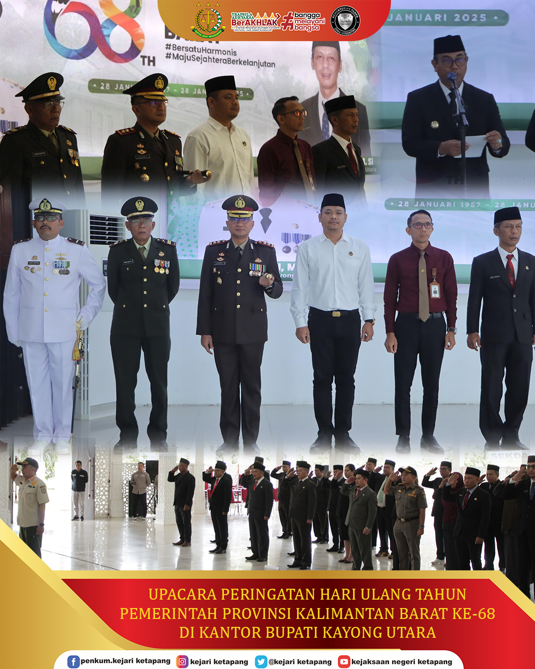 Bertempat bertempat di Pendopo Bupati Kabupaten Kayong Utara. Kepala Kejaksaan Negeri Ketapang diwakili oleh Kepala Seksi Intelijen Kejaksaan Negeri Ketapang Panter Rivay Sinambela, S.H., menghadiri Upacara Peringatan Hari Ulang Tahun (HUT) Ke-68 Pemerintah Provinsi Kalimantan Barat Tahun 2025 di Kabupaten Kayong Utara.