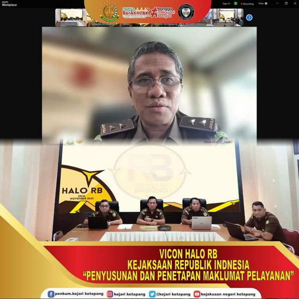 Bertempat di Aula Kantor Kejaksaan Negeri Ketapang, Kepala Kejaksaan Negeri Ketapang diwakili oleh Kepala Sub Bagian Pembinaan Andhika Fery Kurniawan, S.H. beserta Staf Pembinaan mengikuti mengikuti Video Conference (Vicon) Pelaksanaan HaloRB Periode November Tahun 2024 dengan Tema Pedoman Jaksa Agung No.7 Tahun 2024 tentang Standar Pelayanan Publik di Lingkungan Kejaksaan RI.