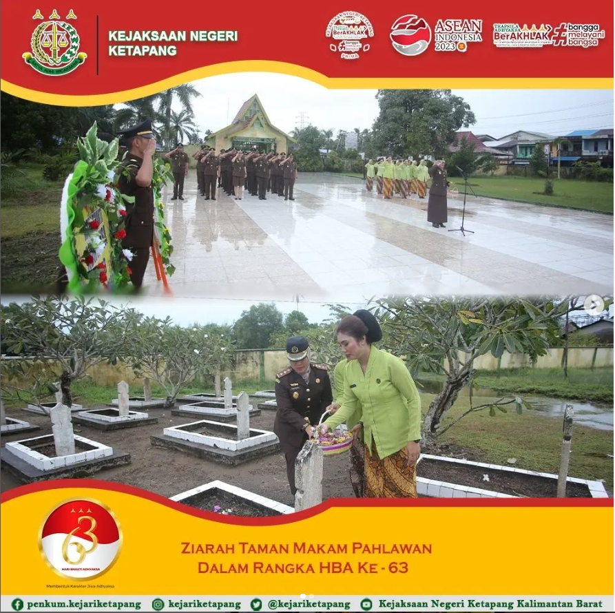 Kepala Kejaksaan Negeri Ketapang Ibu RA. DHINI ARDHANY, S.H., M.H. Mengadakan kegiatan Ziarah ke Taman Makam Pahlawan Sukaharja, yang diikuti seluruh pegawai Kejaksaan Negeri Ketapang, serta ibu-ibu Anggota Ikatan Dharmakarini Daerah Ketapang, dalam rangka memperingati Hari Bhakti Adhyaksa Ke-63 dan HUT Ikatan Adhyaksa Dharmakarini Ke-XXIII Tahun 2023.